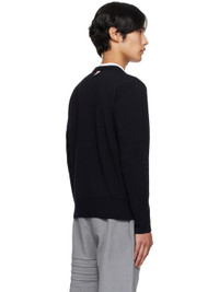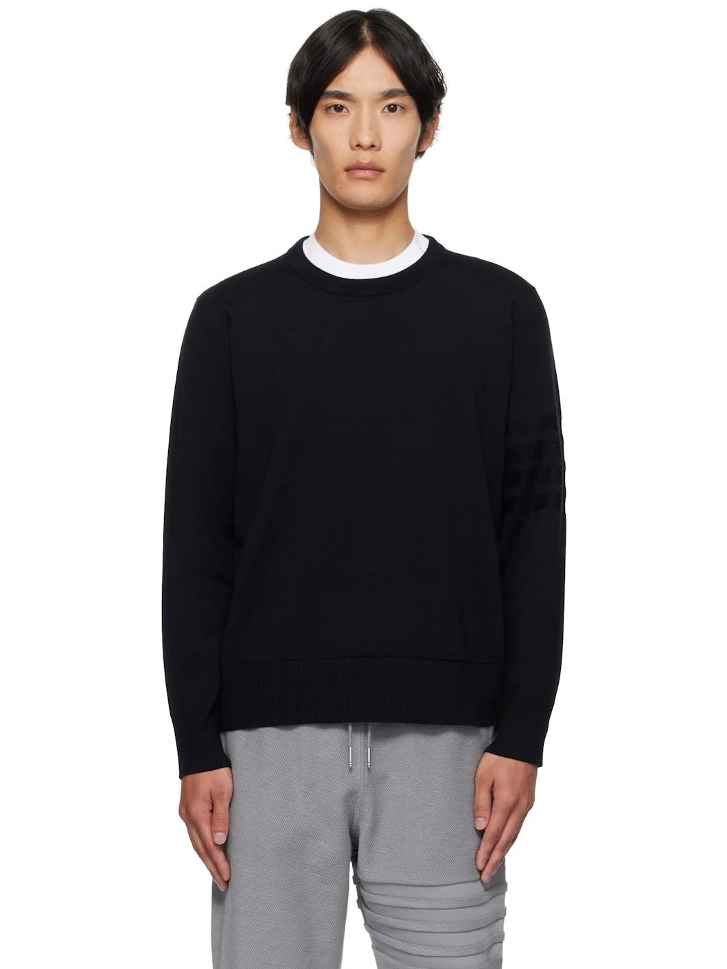 Knit virgin merino wool sweater. · Rib-knit crewneck, hem, and cuffs · Rib-knit linen- and cotton-blend stripes at sleeve · Tricolor grosgrain flag at back collar Supplier color: Navy Body: 68% virgin wool, 20% linen, 9% cotton, 3% polyamide. Made in Italy 252381M201009