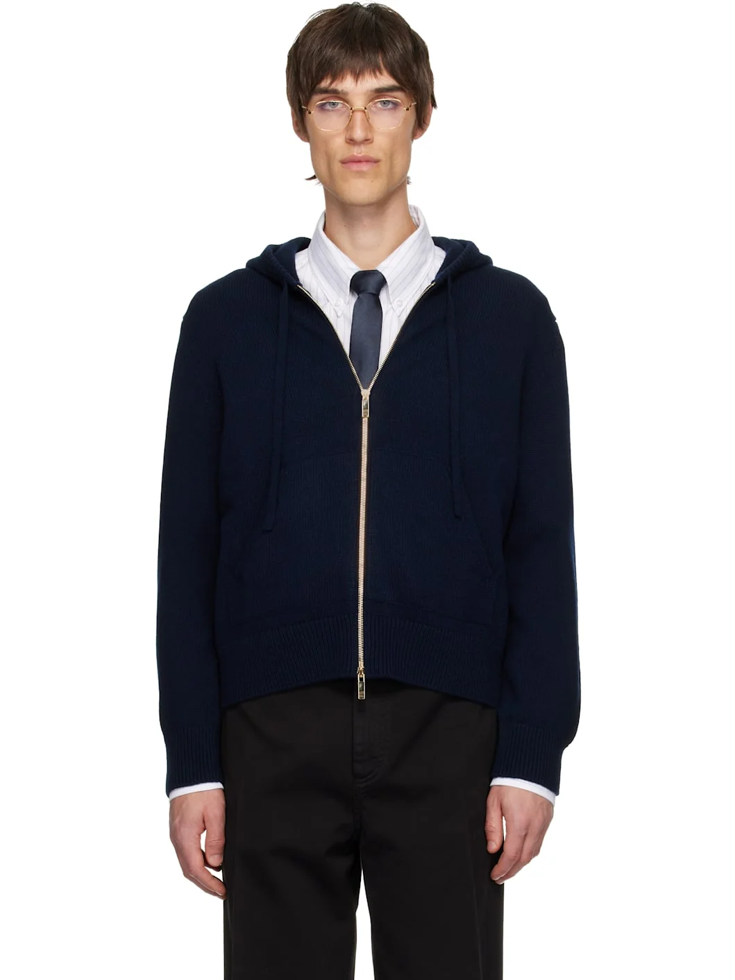 Knit virgin wool hoodie. · Drawstring at hood · Two-way zip closure · Patch pockets at front · Rib-knit hem and cuffs · Button vent at cuffs · Tricolor grosgrain flag at back collar · Intarsia graphic at back Supplier color: Navy 100% virgin wool. Made in Italy 252381M202006
