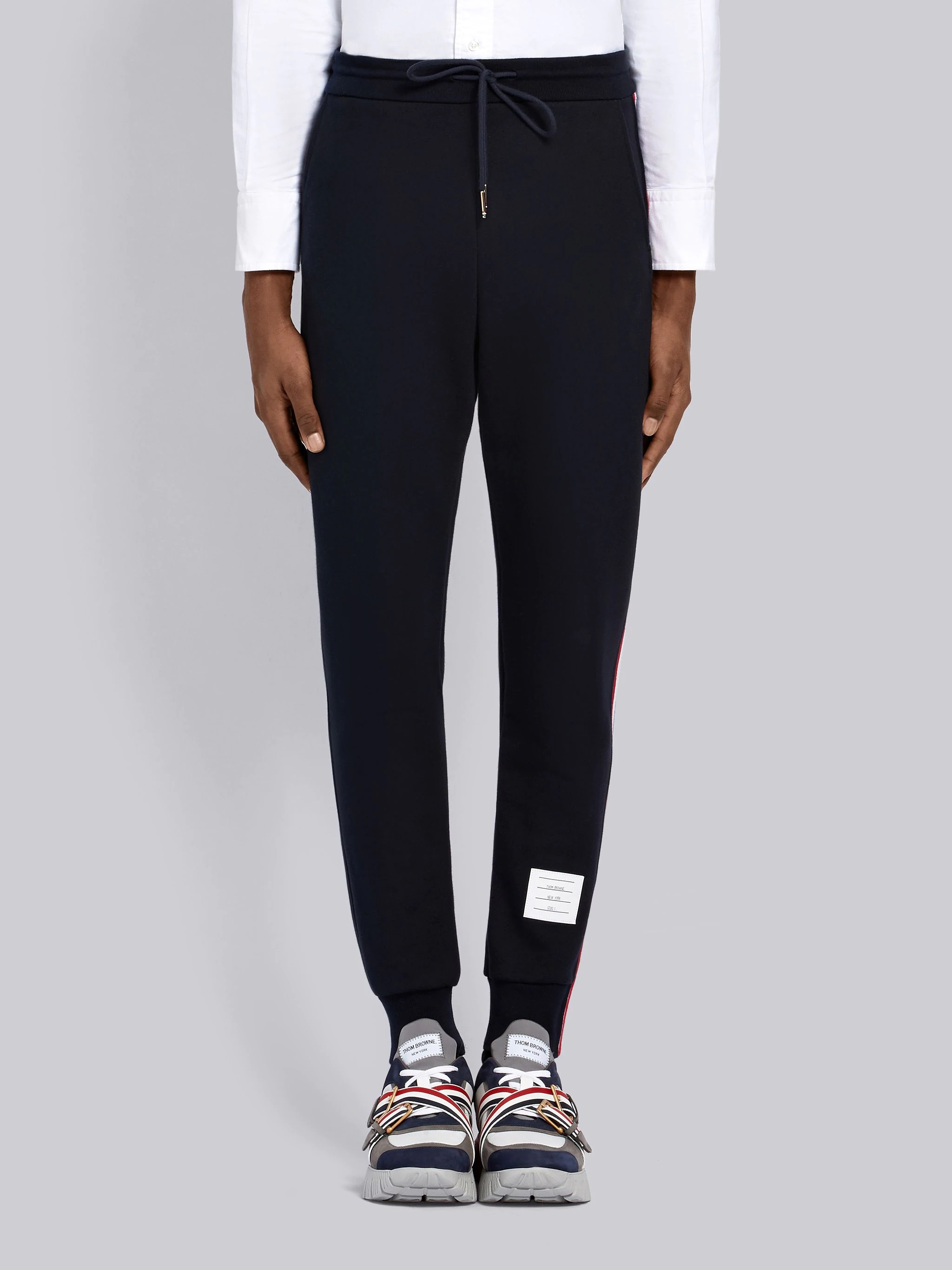 DETAILS & FIT Leisurewear made artful. Our Classic Loopback Stripe Sweatpant is adorned with our signature striped grosgrain trim. Drawstring waistband with silver tone aglets Name tag applique above left cuff Slant side pockets Single back welt pocket Side stripe detail Signature striped grosgrain loop tab at back waist Model is 6' 1" (185cm), wearing size 0 100% Cotton Made in Italy MJQ066A-03377-415