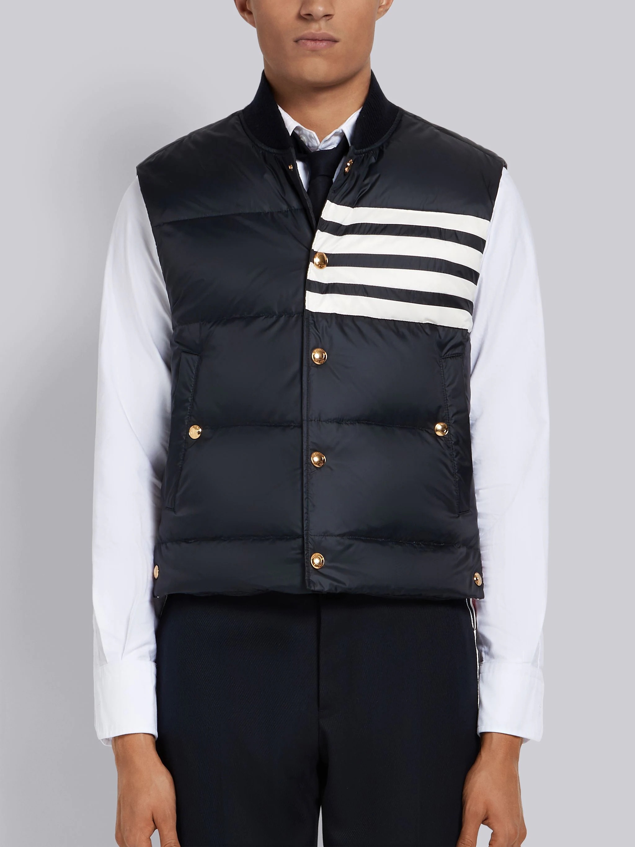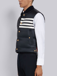 DETAILS & FIT Navy Snap-Front Vest Contrast 4-Bar Stripe Dropped Back Down-Filled Rib Collar Welt Pockets Nylon Matte Finish Signature Grosgrain Trim Signature Grosgrain Loop Tab Model is 6'1" (186 cm), wearing size 0. NOTES 100% Polyamide Shell 80% Down, 20% Feather Made in Italy MVD017X05411415