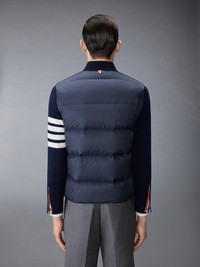 Navy Snap-Front Vest Contrast 4-Bar Stripe Dropped Back Down-Filled Rib Collar Welt Pockets Nylon Matte Finish Signature Grosgrain Trim Signature Grosgrain Loop Tab Model is 6'1"; (186 cm), wearing size 0. MVD017X-05411-415