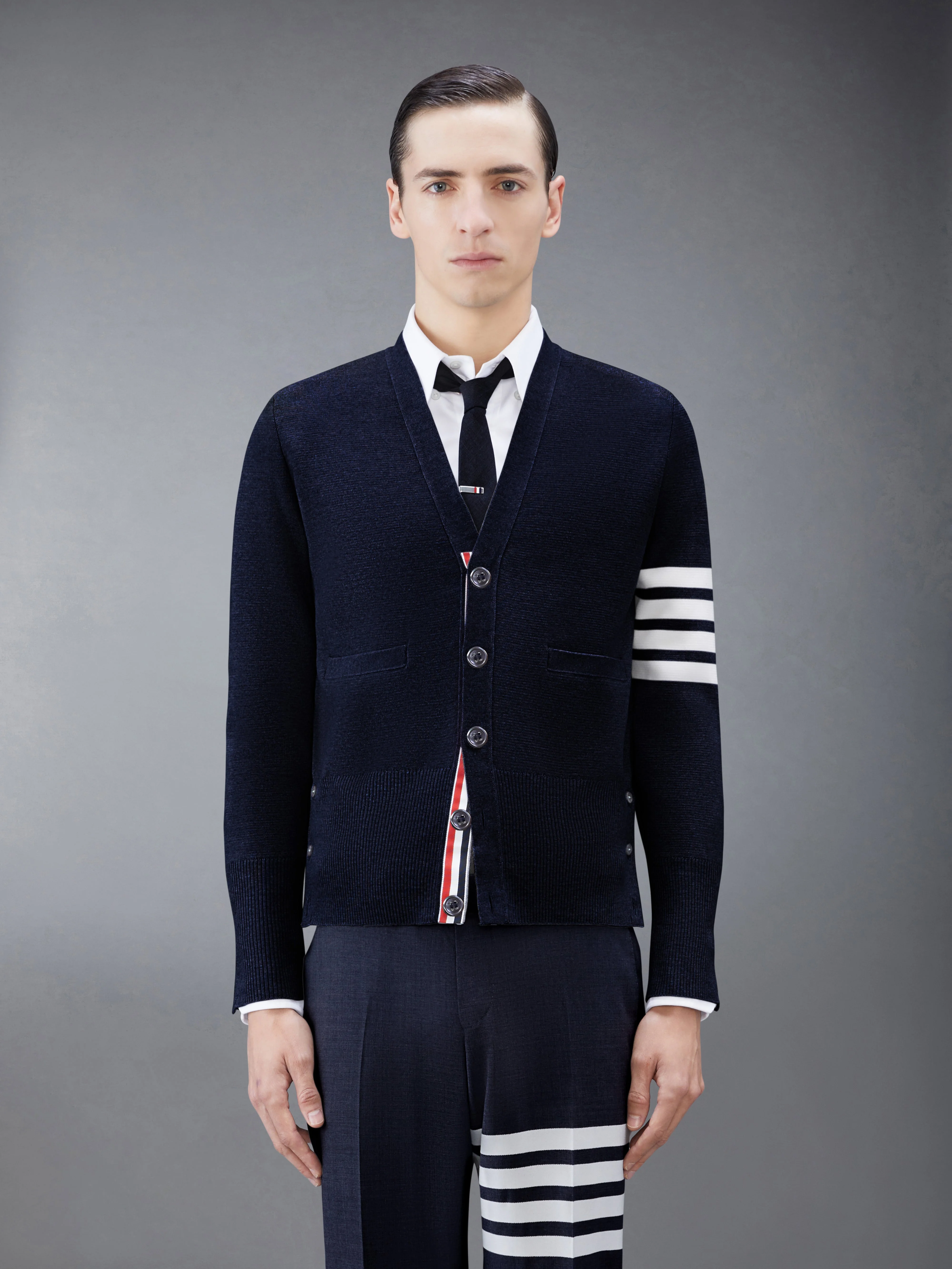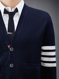 DETAILS & FIT Two Thom Browne emblems define our Wool 4-Bar V-neck Cardigan —grosgrain trim and 4-Bar stripe detailing, both synonymous with the brand. Presented in fine merino fabric, this cardigan exudes sophistication. V-neckline Front button closure with striped grosgrain placket 4-bar stripe detail at left sleeve Buttoned side vents and cuffs with signature striped grosgrain trim Signature striped grosgrain loop tab at back of neck Model is 6' 1" (185cm), wearing size 1 100% Virgin Wool Made in Italy MKC160A-00014-415 - CHEST: 100.0cm - Shoulder Width: 38.0cm - WAIST: 96.0cm