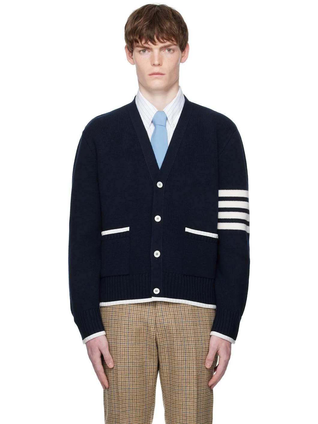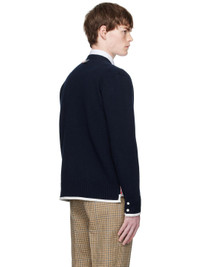 Knit virgin wool cardigan. · Grosgrain trim throughout · Rib-knit Y-neck, hem, and cuffs · Button closure · Patch pockets at waist · Button vent at side seams and cuffs · Stripes at sleeve · Tricolor grosgrain flag at back collar Supplier color: Navy 100% virgin wool. Made in Italy 252381M200018