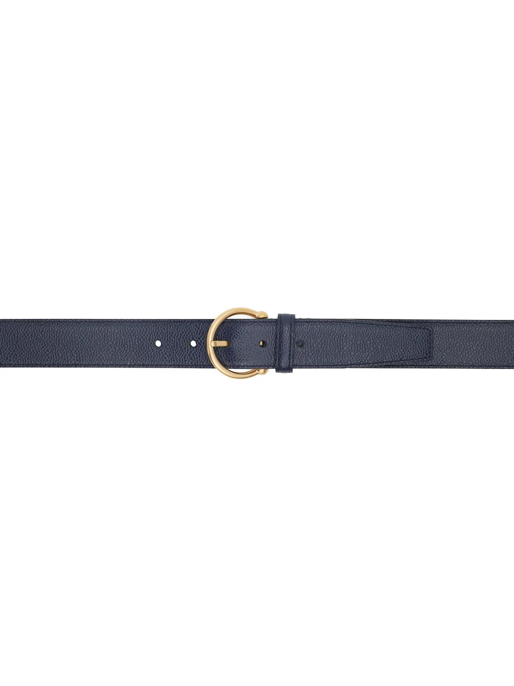 Pebble-grained calfskin belt in navy. · Pin-buckle fastening · Gold-tone hardware · W1.5" Supplier color: Navy Calfskin. Made in Italy 252381M131001