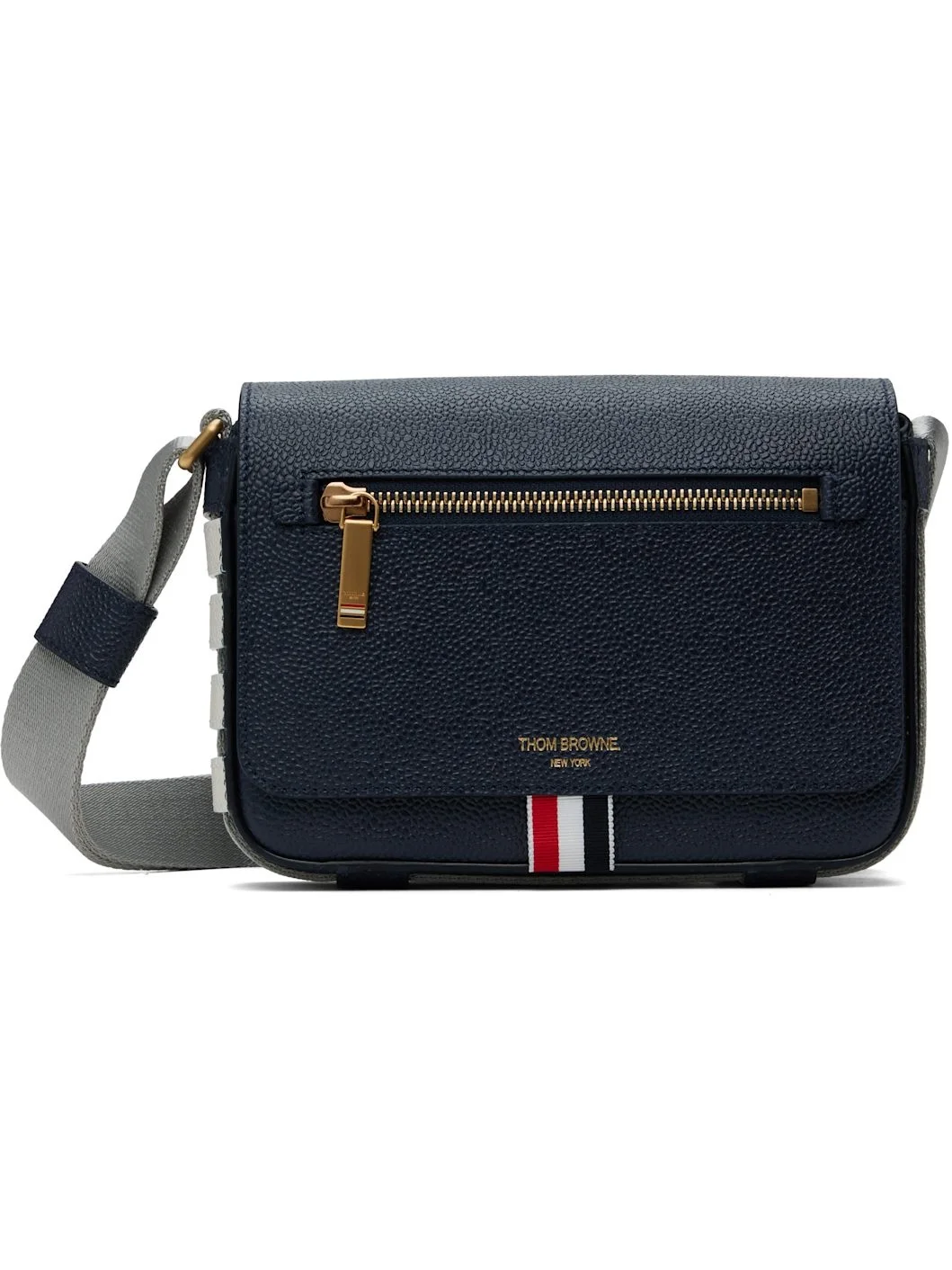 Pebble-grained calfskin messenger bag in navy. · Adjustable crossbody strap · Zip pocket and logo stamp at face · Tricolor grosgrain flag at face · Patch pocket at back face · Magnetic press-stud flap · Patch pocket at interior · Tricolor grosgrain lining · H5.5" x W7.5" x D2.25" Supplier color: Navy Calfskin. Made in Italy 252381M170003