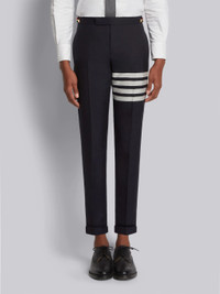 DETAILS & FIT Our Plain Weave 4-Bar Backstrap Trouser. The classic shortened hem pays homage to Thom Browne's distinguished tailoring. Tab front closure Adjustable buttoned waist strap 4-bar stripe detail Slip side pockets Button-fastening jetted hip pockets Signature striped grosgrain loop tab at back waist Model is 6' 1" (185cm), wearing size 0 100% Wool Lining: 100% Cupro Made in Italy MTC159A-06146-415