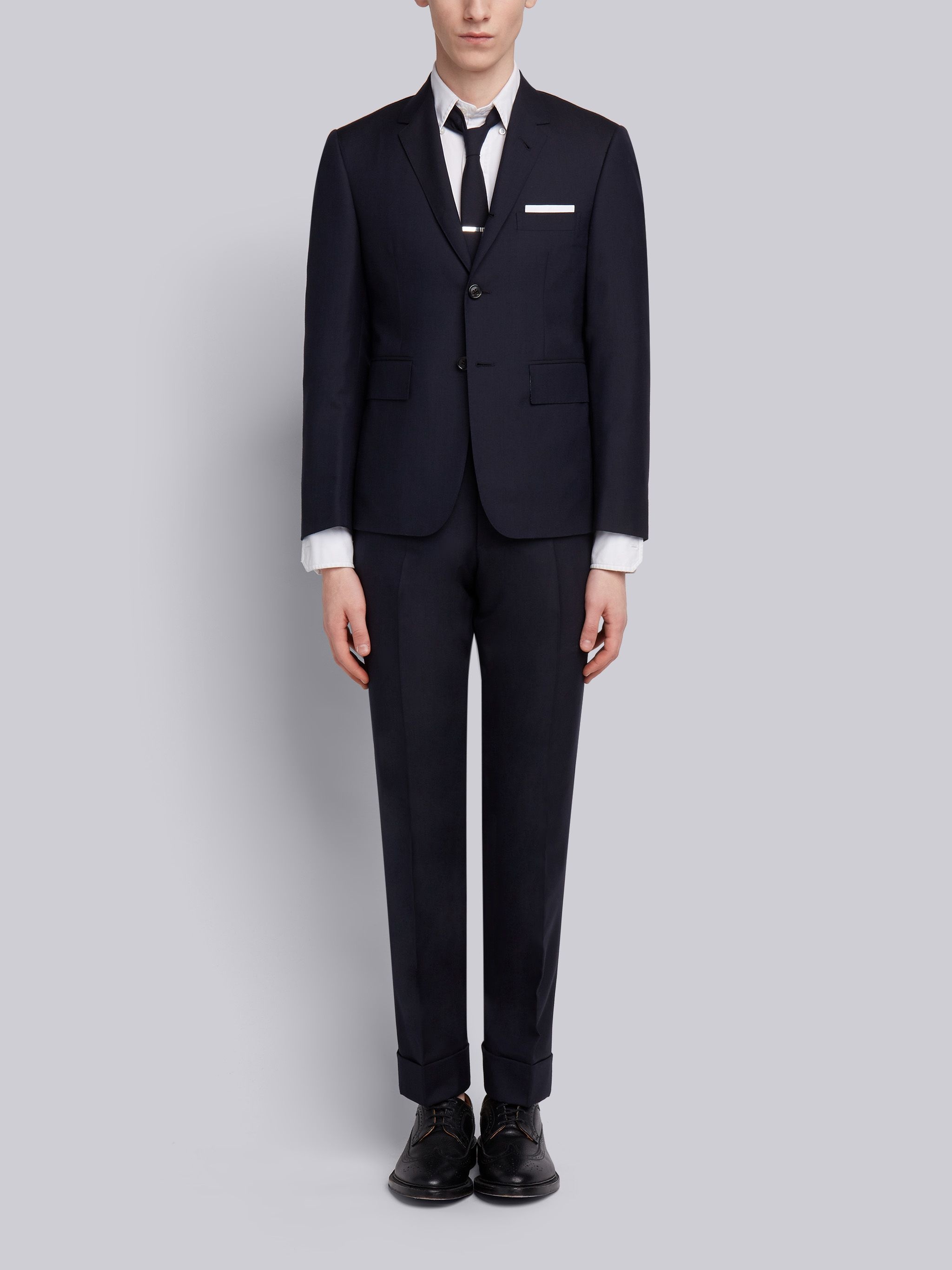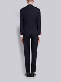 DETAILS & FIT Classic fit suit in navy super 120's plain weave wool. Single-breasted sport coat with notched lapels, buttoned cuffs, double vented back hem, striped lining. Sport coat features 2 flap pockets and single chest pocket. Classic trouser with adjustable backstrap and jetted hip pockets. Signature striped grosgrain loop tabs at back of neck and waist. Model is 6' 1" (185mm), wearing size 0. 100% Wool Made in Italy MSC001A00889415