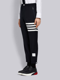 DETAILS & FIT Track trouser in navy super 120's wool twill with 4-bar stripe detail at left thigh in white. Snap button closure, elastic waistband, zippered pockets. Name tag appliqué above buttoned cuffs. Signature striped grosgrain loop tab at back waist. Model is 6' 1" (185mm), wearing size 0. 100% Wool Made in Japan MTT012A00626415