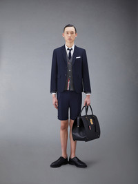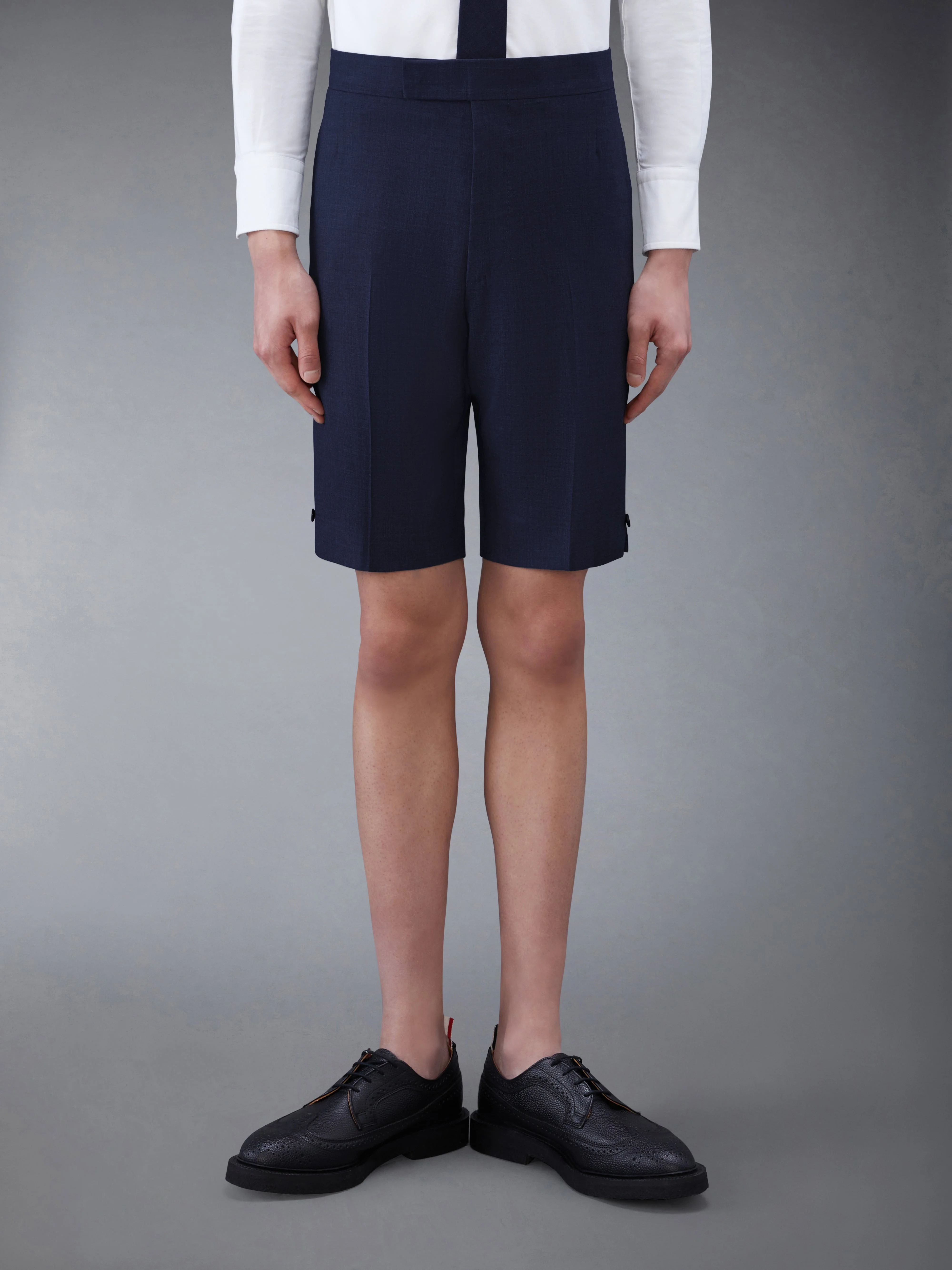 DETAILS & FIT Our Classic Twill Backstrap Shorts. Wide cuffs pay homage to Thom Browne’s distinguished tailoring. Tab front closure Slip side pockets Button-fastening jetted hip pockets Creased legs Wide cuffs Adjustable buttoned backstrap Signature striped grosgrain loop tab at back waist ClassicFit 1 Model is 6' 1" (185cm), wearing size 0 100% Wool Made in Italy MTC002A-00626-415