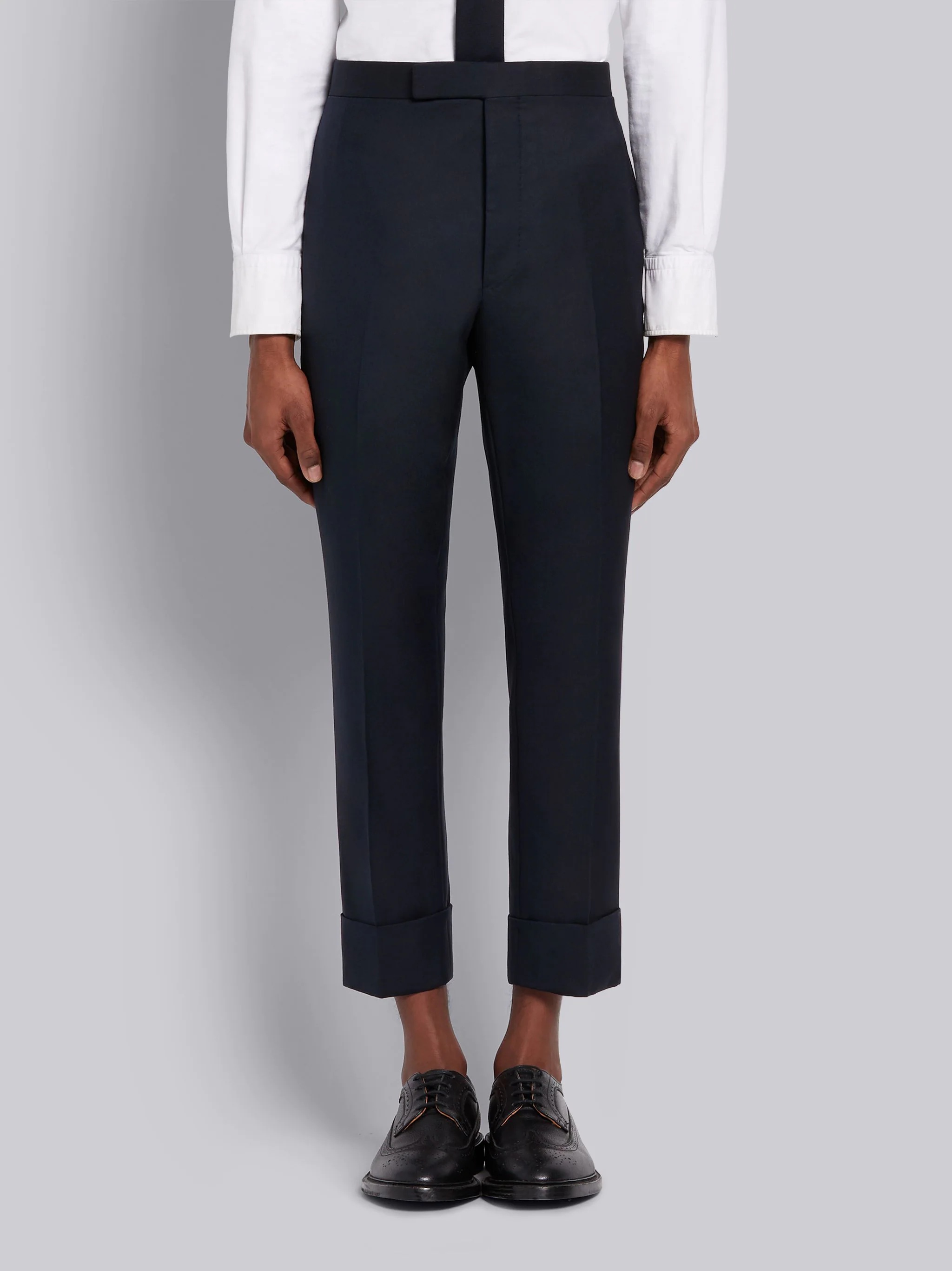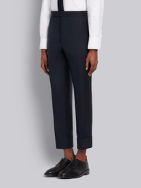 DETAILS & FIT Our Classic Twill Backstrap Trouser. The classic shortened hem pays homage to Thom Browne’s distinguished tailoring. Tab front closure Slip side pockets Button-fastening jetted hip pockets Creased legs Wide cuffs Adjustable buttoned backstrap Signature striped grosgrain loop tab at back waist ClassicFit 1 Model is 6' 1" (185cm), wearing size 0 100% Wool Lining: 100% Cupro Made in Italy MTC001A-00626-415