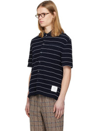 Waffle-knit cotton- and linen-blend shirt. · Striped pattern throughout · Rib-knit spread collar · Button closure · Patch pocket at chest · Logo patch at hem · Tennis-tail hem · Tricolor grosgrain flag at back collar Supplier color: Navy/White 74% cotton, 26% linen. Made in Italy 261381M192013