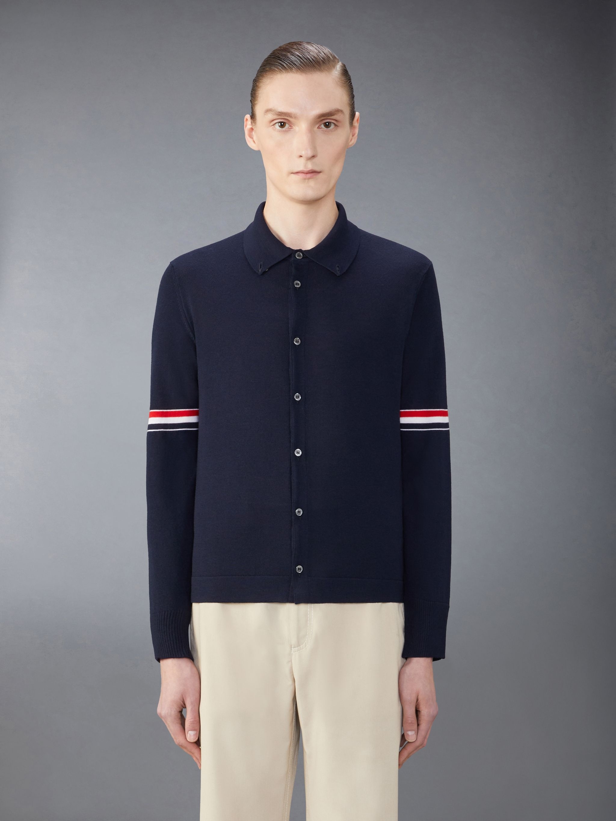 DETAILS & FIT A fall/winter essential, our Oxford Long Sleeve Armband Shirt exhibits quality craftsmanship and meticulous tailoring. Layer it under one of our signature shirt jackets for added warmth. Jersey stitch button down Point collar Front button closure Button cuffs and side vents with signature striped grosgrain trim Signature striped grosgrain armbands Signature striped grosgrain loop tab Model is 6' 1" (185cm), wearing size 1 100% Virgin Wool, 100% Wool Made in Italy MKL005A-Y1002-415