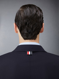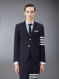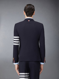 Classic sport coat in navy plain weave suiting with engineered tonal 4-bar stripe detail at left sleeve. Brass button front closure, notched lapels, 2 flap front pockets, single chest pocket. Buttoned cuffs with signature striped grosgrain trim. Double vented back hem. Striped lining with interior pocket and name tag. Signature striped grosgrain loop tab at back of neck. Classic - Fit 1. Model is 6' 1" (185cm), wearing size 0. 100% Wool Made in Italy MJC001A-06146-415