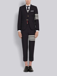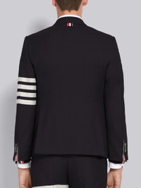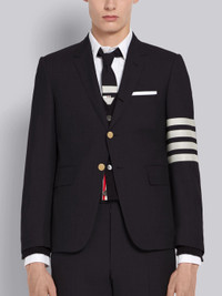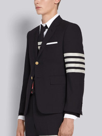 DETAILS & FIT Navy Sport Coat Plain Weave Suiting Contrast 4-Bar Stripe Single-Breasted Double Vent Notched Lapel Two Flap Pockets Single Chest Pocket Signature Grosgrain Trim Signature Grosgrain Loop Tab Model is 6'1" (186 cm), wearing size 0. NOTES 100% Wool Made in Italy MJC001A06146415