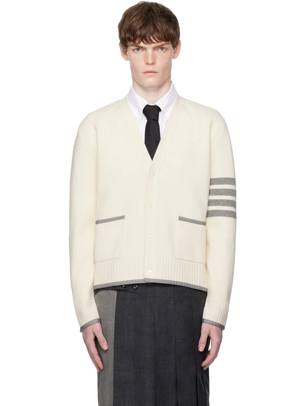 Knit virgin wool cardigan. · Grosgrain trim throughout · Rib-knit Y-neck, hem, and cuffs · Button closure · Patch pockets at waist · Button vent at side seams and cuffs · Stripes at sleeve · Tricolor grosgrain flag at back collar Supplier color: White 100% virgin wool. Made in Italy 252381M200020