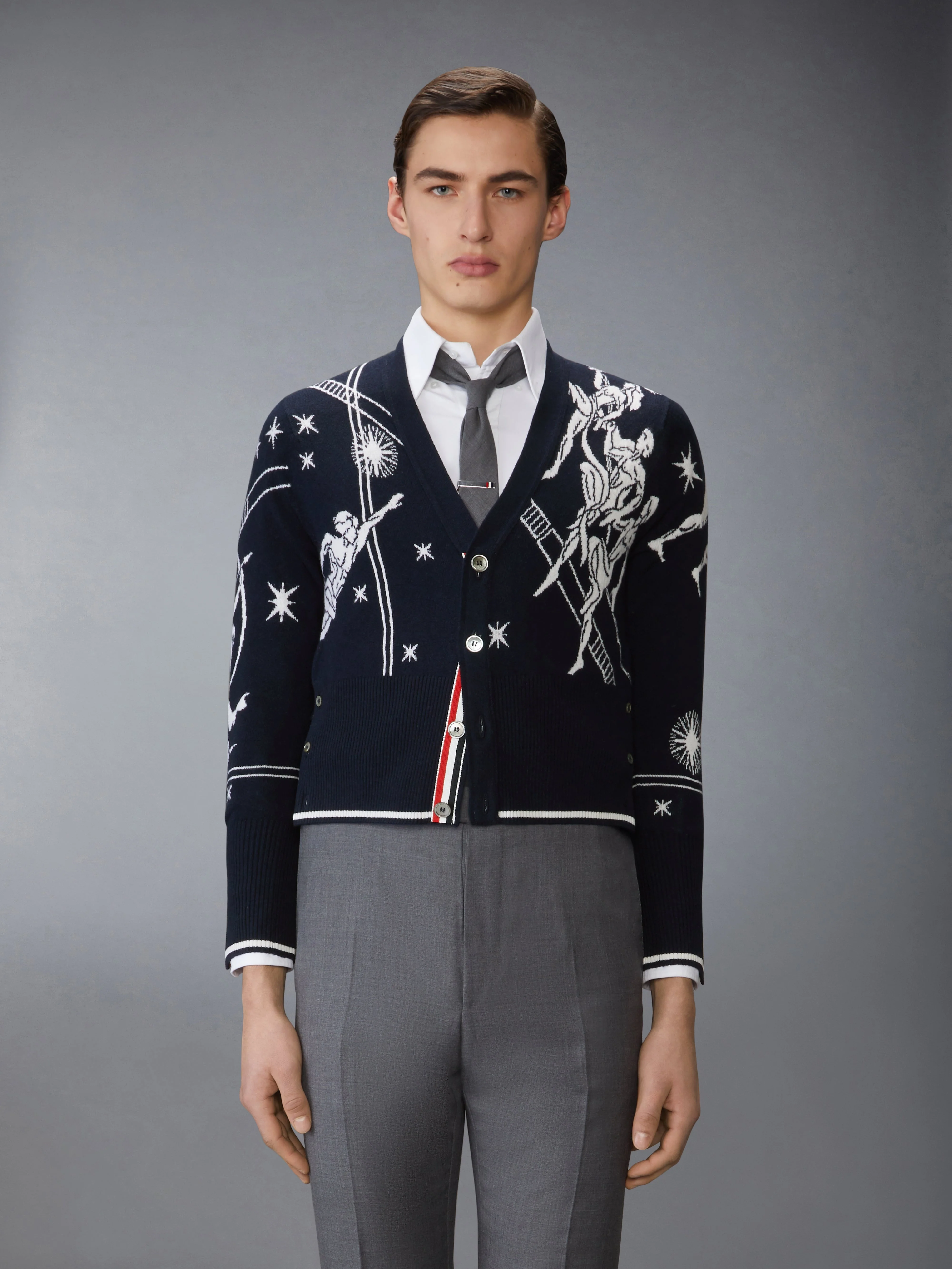 Wrap yourself in a celebration of greatness. Archers, track stars, and wrestlers adorn this artful cardigan, inspired by the perseverance, discipline, and strength of ancient Grecian Olympians. Crafted from luxurious cashmere for ultimate warmth and comfort. Front button closure with striped grosgrain placket Buttoned cuffs with signature striped grosgrain trim Signature striped grosgrain loop tab Model is 6'1" (185cm), wearing size 1 100% Cashmere Made in Great Britain MKC590A-Y2001-415