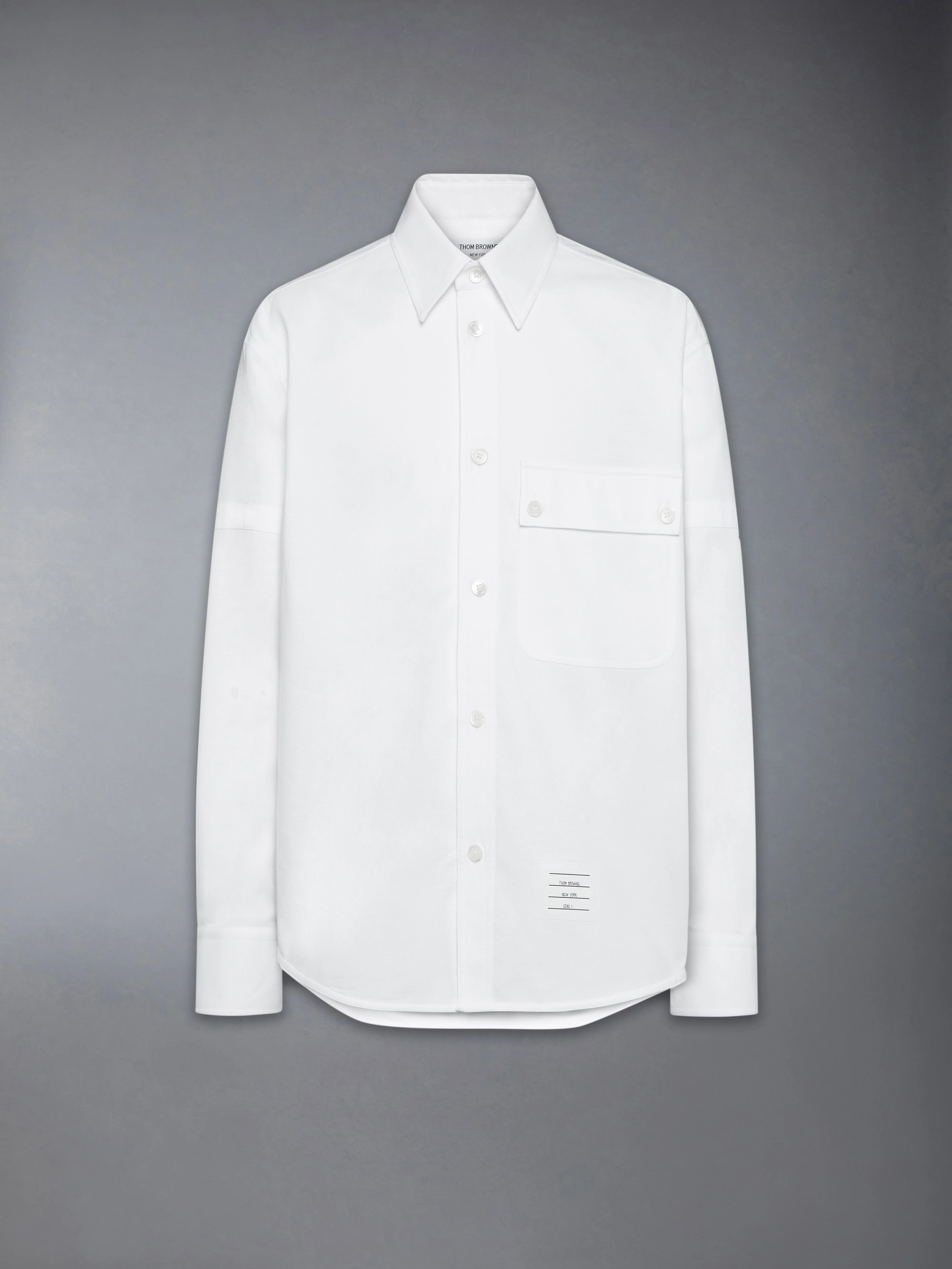 Tailored in cotton pique, this shirt refines a classic silhouette with subtle texture and shape. Self-fabric armbands nod to workwear foundations, while the volume softens its architectural precision. Wear under the Lightweight Down-Filled Shiny Ripstop 4-Bar Vest for layered structure. Front button closure Point collar Patch chest pocket with buttoned flap Button-fastening self armbands Buttoned cuffs Pleated back yoke with locker loop Curved stepped hem Name tag applique Signature striped grosgrain loop tab Oversized fit Model is 6'1" (185cm), wearing size 1 100% Cotton Made in Italy MWL430O-00185-100
