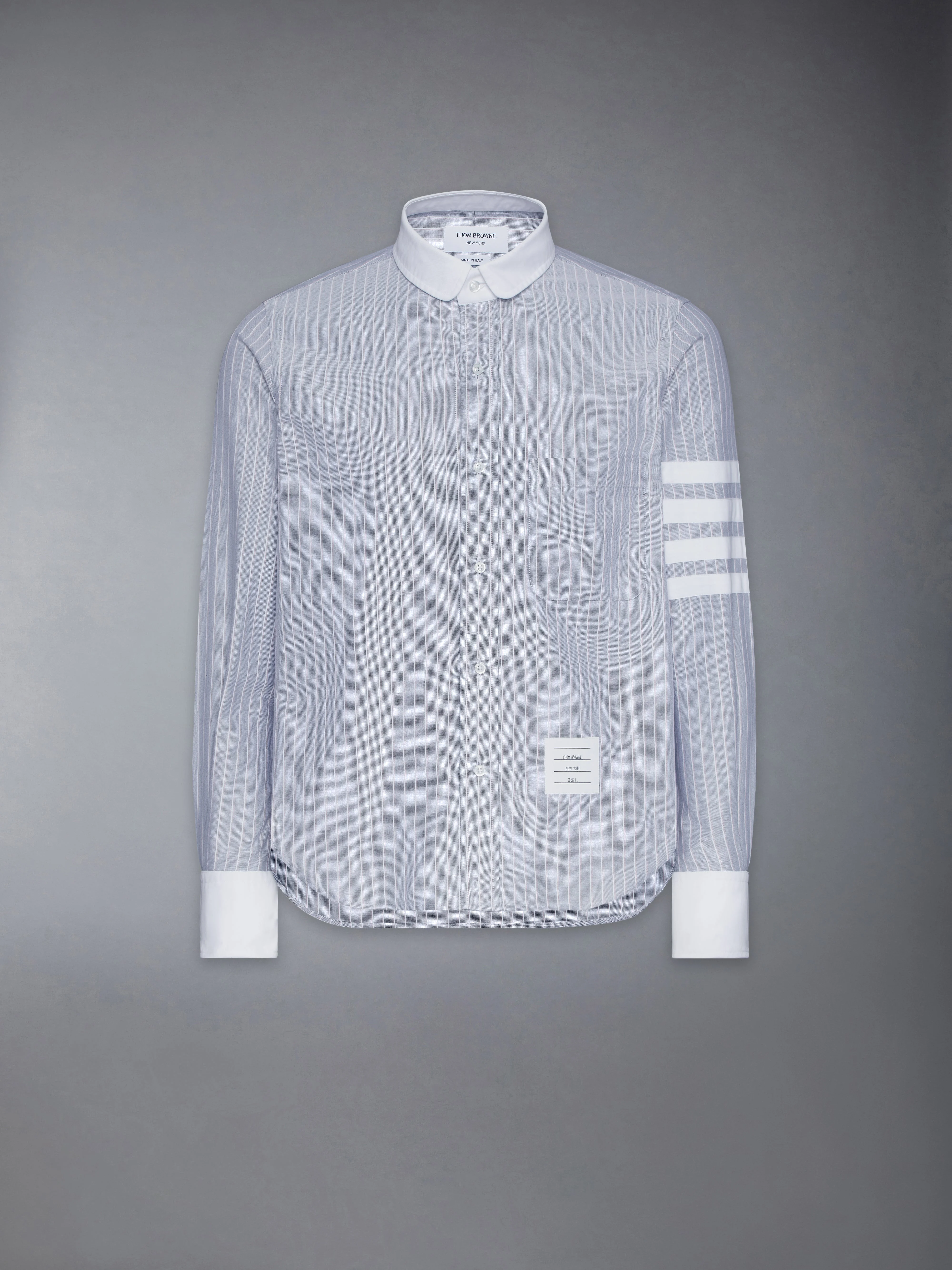 DETAILS & FIT Adorned with a playful pinstripe pattern, this shirt will serve as a staple in your polished spring wardrobe. Front button closure Chest patch pocket 4-bar detailing Pleated back yoke with locker loop Nametag applique Signature striped grosgrain loop tab Model is 6'1" (185cm), wearing size 1 100% Cotton Combo 1: 100% Cotton Made in Italy MWL414C-F0013-415