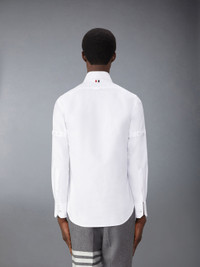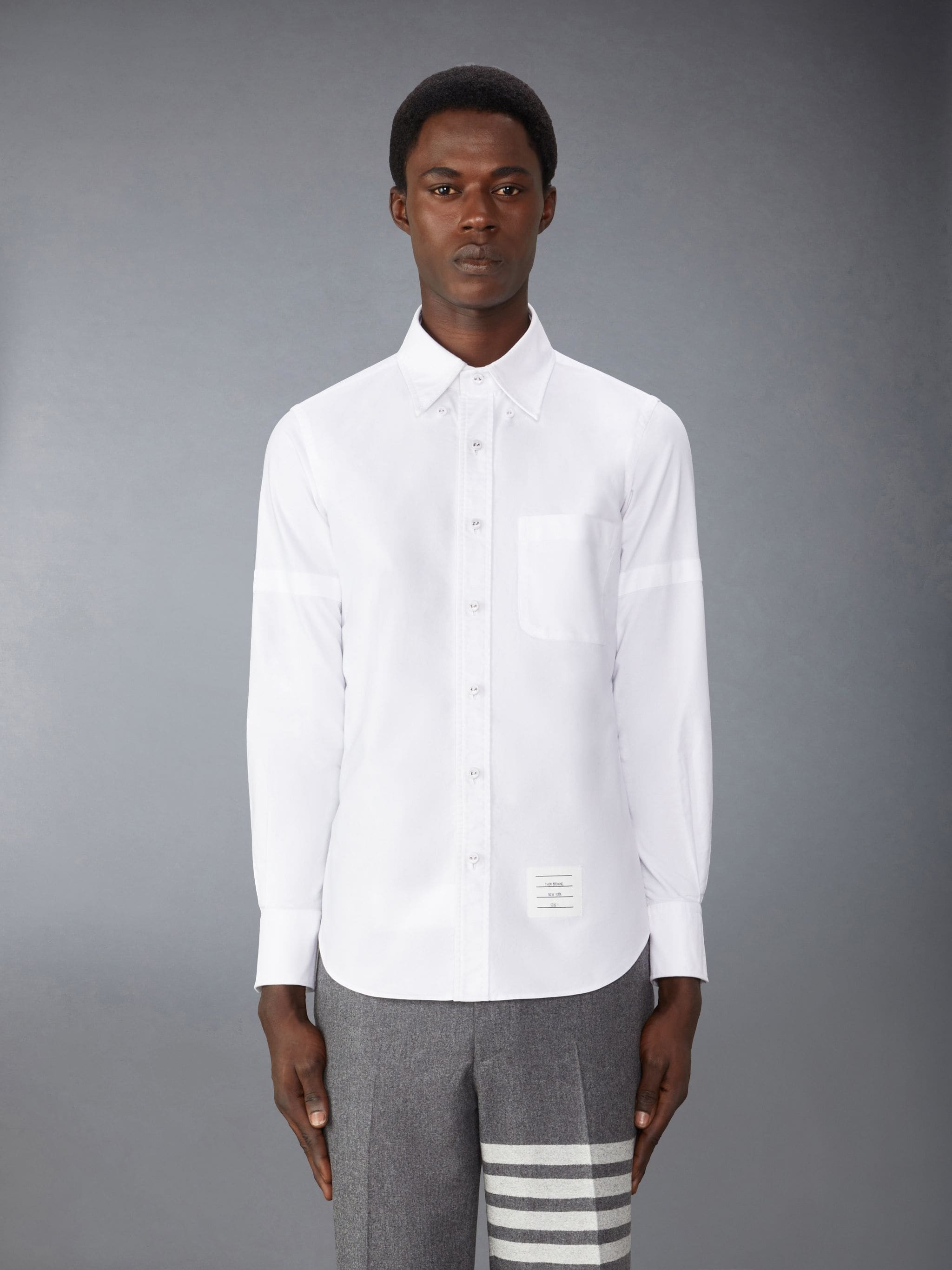 DETAILS & FIT A Thom Browne essential, our Oxford Armband Shirt exhibits quality craftsmanship and meticulous tailoring. Pair it with one of our signature trousers. Front button closure Patch chest pocket Name tag applique above hem Oxford armbands Pleated back yoke with locker loop Signature striped grosgrain loop tab Model is 6' 1" (185cm), wearing size 1 100% Cotton Made in Italy MWL403O-F0313-100