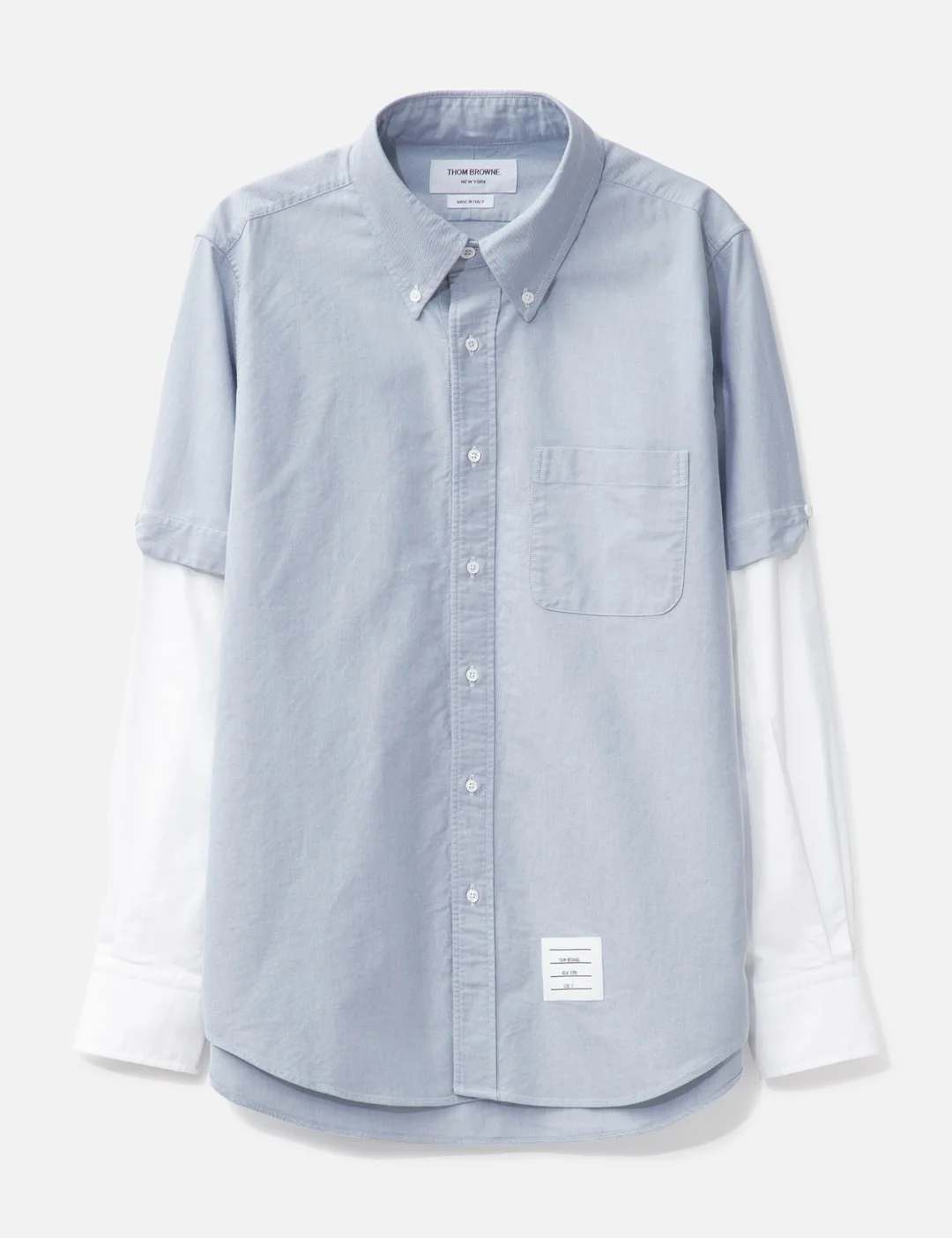 - Thom Browne - Oxford Stacked Sleeve Shirt - Classic silhouette - Button closure - Stacked sleeves - Signature striped grosgrain loop tab - Pleated rear yoke with locker loop - Curved hem - Color: Light Blue - Material: 100% Cotton - See more Shirts and Clothing SIZING - Model wears size L - Model measures: Height 186cm, Chest 34”/86cm, Waist 28”/71cm, Hip 36”/91cm