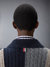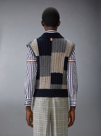 A patchwork sweater in gorgeous fall hues. For this collection, Thom meticulously designed each piece to mix and match seamlessly with other patterns. Layer this sweater over our Gingham Check Poplin Armband Shirt. Signature striped grosgrain loop tab Model is 6'1" (185cm), wearing size 1 70% Wool, 30% Mohair Made in Italy MKV092A-Y1032-978