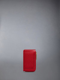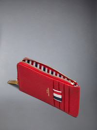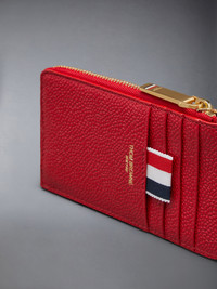 Half zip long wallet in red pebble grain leather with 4 exterior card slots. Brass zip around closure, exterior slip pocket, striped lining. Gold foil printed logo and signature striped grosgrain loop tab at exterior. 100% Calf Full Grain Leather Lining: 100% Polyester Made in Italy UAW006A-00198-600