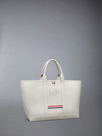 Inspired by traditional tool bags, this medium tote brings a utility-driven silhouette into the Thom Browne world. Crafted in pebble grain leather, it features a structured base and a perforated Hector motif that adds charm to function. RWB grosgrain trims finish the design with signature precision—structured, playful, and ready for daily use. Top snap closure Top handles RWB grosgrain detail Reinforced bottom panel Interior zip pocket Tricolor lining Perforated Hector motif Signature striped grosgrain loop tab 100% Calf Full Grain Leather Lining: 100% Polyester Made in Italy UAG259A-00198-250