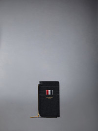 Half zip long wallet in black pebble grain leather with 4 exterior card slots. Brass zip around closure, exterior slip pocket, striped lining. Gold foil printed logo and signature striped grosgrain loop tab at exterior. 100% Calf Full Grain Leather Lining: 100% Polyester Made in Italy UAW006A-00198-001