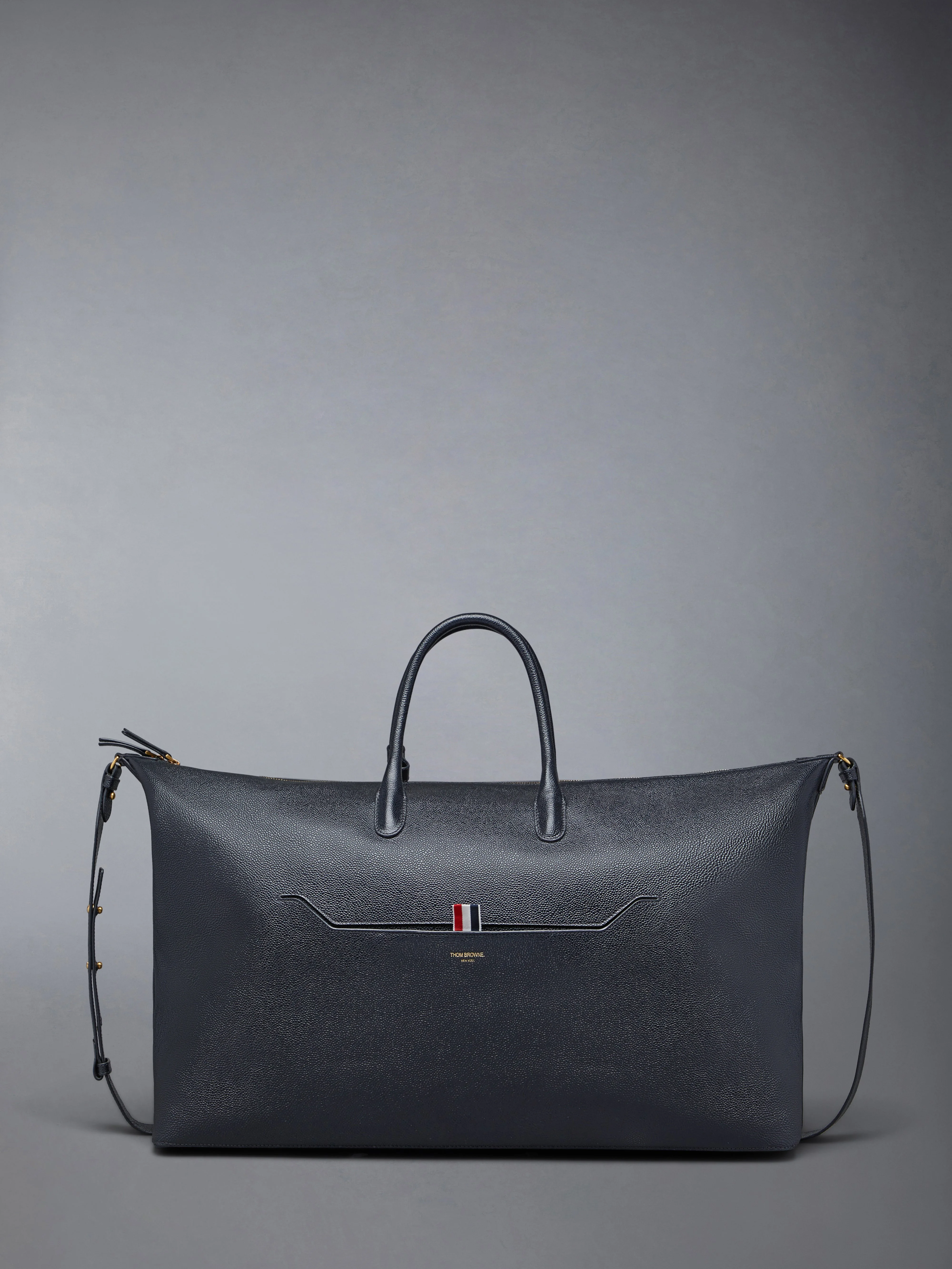 DETAILS & FIT For weekends away or days on-the-go, this duffle is sharp, functional, and sophisticated. Brass zip middle compartment Exterior vent pocket Interior nametag Interior zip pocket Signature striped lining Signature striped grosgrain loop tab Gold foil logo Crossbody strap 100% Calf Full Grain Leather Lining: 100% Polyester Made in Italy MAG411A-00198-001