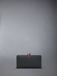Zip around slim long wallet in dark grey pebble grain leather with internal coin compartment. Brass zip around closure, interior slip pocket, striped lining. Gold foil printed logo and signature striped grosgrain loop tab at exterior. 100% Calf Full Grain Leather Lining: 100% Lamb Leather Lining 2: 100% Polyester Made in Italy UAW005A-00198-025