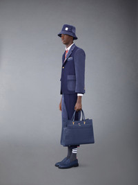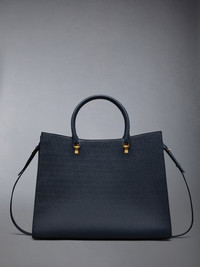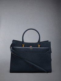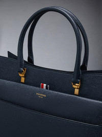 Large duet tote in blue pebble grain leather. Double rounded leather top handles, large front folio pocket. Brass hardware. Gold foil printed logo and signature striped grosgrain loop tab at front pocket entry. 100% Calf Full Grain Leather Lining: 100% Polyester Made in Italy MAG228A00198415 MAG228A-00198-415