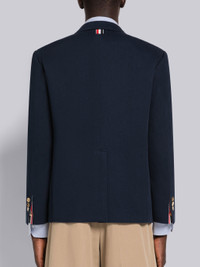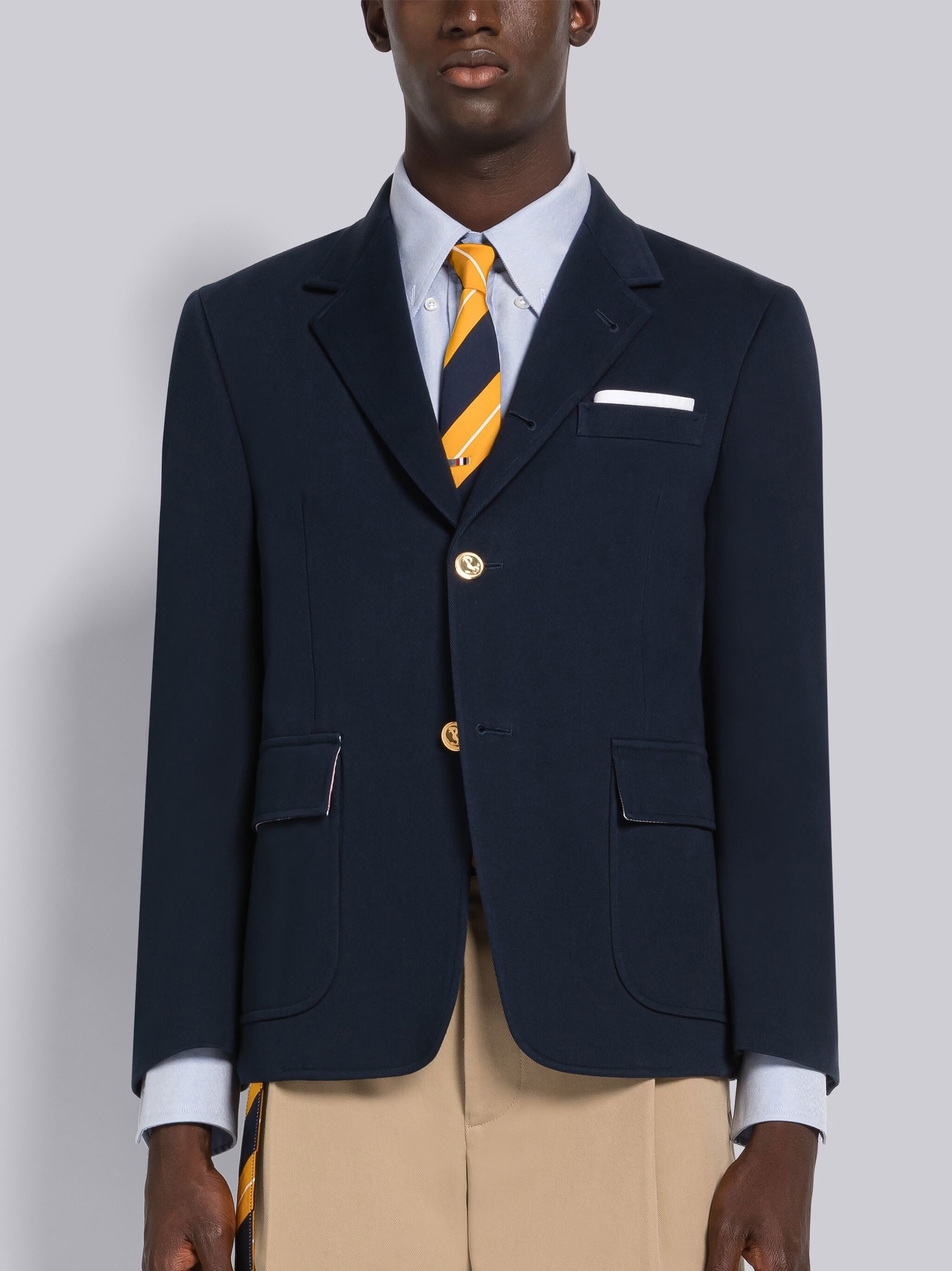 DETAILS & FIT Unconstructed single breasted sport coat in piece-dyed navy cotton gabardine. Brass 2-button front closure, notched lapels, 2 flap front pockets, single chest pocket. Buttoned cuffs with signature striped grosgrain trim. Single back vent. Striped lining with interior pocket and name tag. Signature striped grosgrain loop tab at back of neck. Model is 6' 1" (185cm), wearing size 0. 100% Cotton Made in Japan MJU558AF0175415