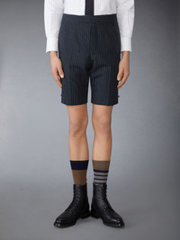 Our classic shorts get a workwear-inspired update with pinstripes drawn from 19th-century uniforms. Gold rivets and luminous gold buttons, embossed with a Thom Browne insignia, add a refined touch. Pair them with our Pinstripe High Twist Wool Sport Coat. Tab front closure Adjustable buttoned backstrap Button-fastening back welt pockets Signature striped grosgrain loop tab Fit 1 Model is 6'1" (185cm), wearing size 0 97% Virgin Wool, 3% Polyester Lining: 100% Cupro Made in Italy MTC002A-F0932-415