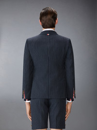 In crafting this sport coat, Thom drew inspiration from 19th-century work uniforms. A new feature—luminous gold buttons embossed with a Thom Browne insignia—elevates its refined design. This sharp piece pairs perfectly with our matching Pinstripe High Twist Wool Shorts. Double breasted front button closure 2 Front flap pockets Single chest pocket Interior pockets with name tag Signature striped grosgrain loop tab Fit 1 Model is 6'1" (185cm), wearing size 1 97% Virgin Wool, 3% Polyester Lining: 100% Cupro Made in Italy MJC018A-F0932-415