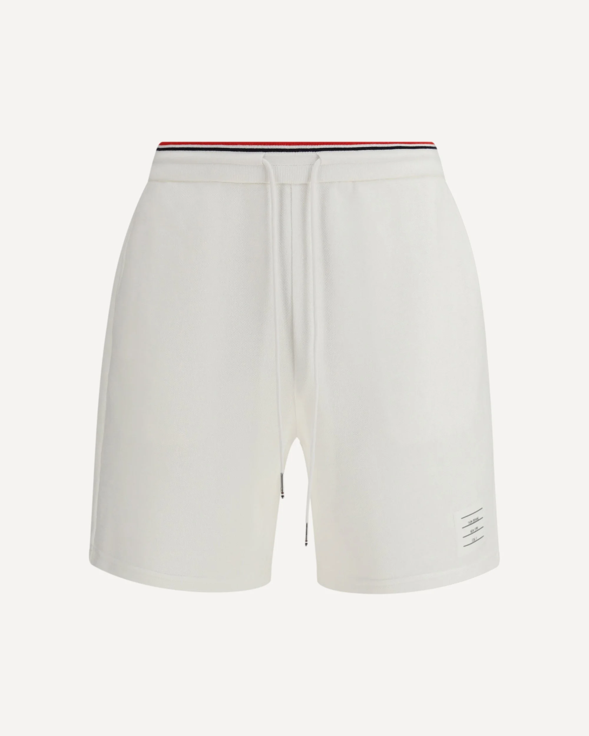 The pique sports Shorts by Thom Browne combine comfort and sporty style. Featuring an adjustable elastic waistband with drawstring, they offer a customizable fit. Side welt pockets and a flap pocket on the back add functionality to the design. The logo patch on the front adds a distinctive and recognizable touch, making these shorts ideal for a casual and classy look. DETAILS - Sku: MJQ236AJ0249_100 - Season: SS26 - Fit: Regular - Composition: GENERAL 100% Cotton - MADE IN JAPAN