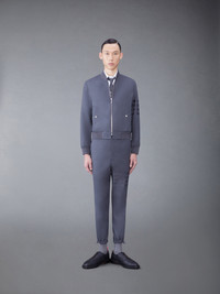 Blouson jacket in grey plain weave suiting with shiny tonal 4-bar stripe detail at left sleeve. Front zip closure, snap fastening welt front pockets. Rib trim at collar, cuffs, and hem. Striped lining with interior pockets and name tags. Signature striped grosgrain loop tab at back of neck. Model is 6' 1" (185cm), wearing size 0. 100% Wool Made in Italy MJO030A-06146-025