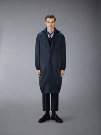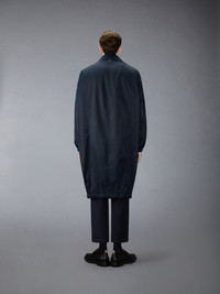 This cocoon windbreaker is cut in a medium-weight technical fabric with a smooth cotton face and nylon twill back, offering structure with a crisp, water-repellent finish. Quilted patch pockets and a detachable padded hood add functional dimension to the silhouette. Worn over suiting, it introduces a fluid layer that offsets the precision of tailored pieces. Front button closure Detachable drawstring hood with button attachment Quilted patch hand pockets Elasticated cuffs Drawstring hem Signature striped grosgrain loop tab Model is 6'1" (185cm), wearing size 1 51% Polyamide, 49% Cotton Combo 1: 100% Polyester Made in Italy MOU638U-F1066-415