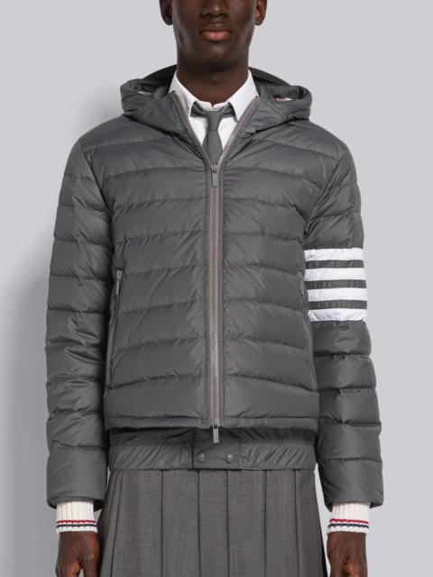 DETAILS & FIT Down-filled ski jacket in medium grey poly twill with 4-bar stripe detail at left sleeve in white. 2-way front zip closure, integrated hood, zip side pockets, ribbed cream cuffs with stripe detailing. Striped lining with striped webbing backpack straps. Signature striped grosgrain loop tab at back of neck. Model is 6' 1" (185cm), wearing size 0. 100% Polyester Combo1:100% Polyester Padding:80% White Goose Down, 20% White Goose Feathers Lining:100% Polyester Made in Italy MJD087X07259035 - SLEEVE LENGTH: 69.0cm - Shoulder Width: 15.0cm - Length: 66.0cm