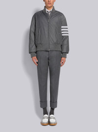 DETAILS & FIT Oversized down-filled blouson jacket in grey poly twill with 4-bar stripe detail at left sleeve in white. 2-way tonal zip front closure, snap-fastening welt side pockets. Ribbed stand collar, cuffs, and hem. Removable striped webbing interior backpack straps. Striped lining with interior pocket and name tag. Signature striped grosgrain loop tab at back of neck. Model is 6' 1" (185cm), wearing size 0. 100% Polyester Made in Italy MJD103X07259035