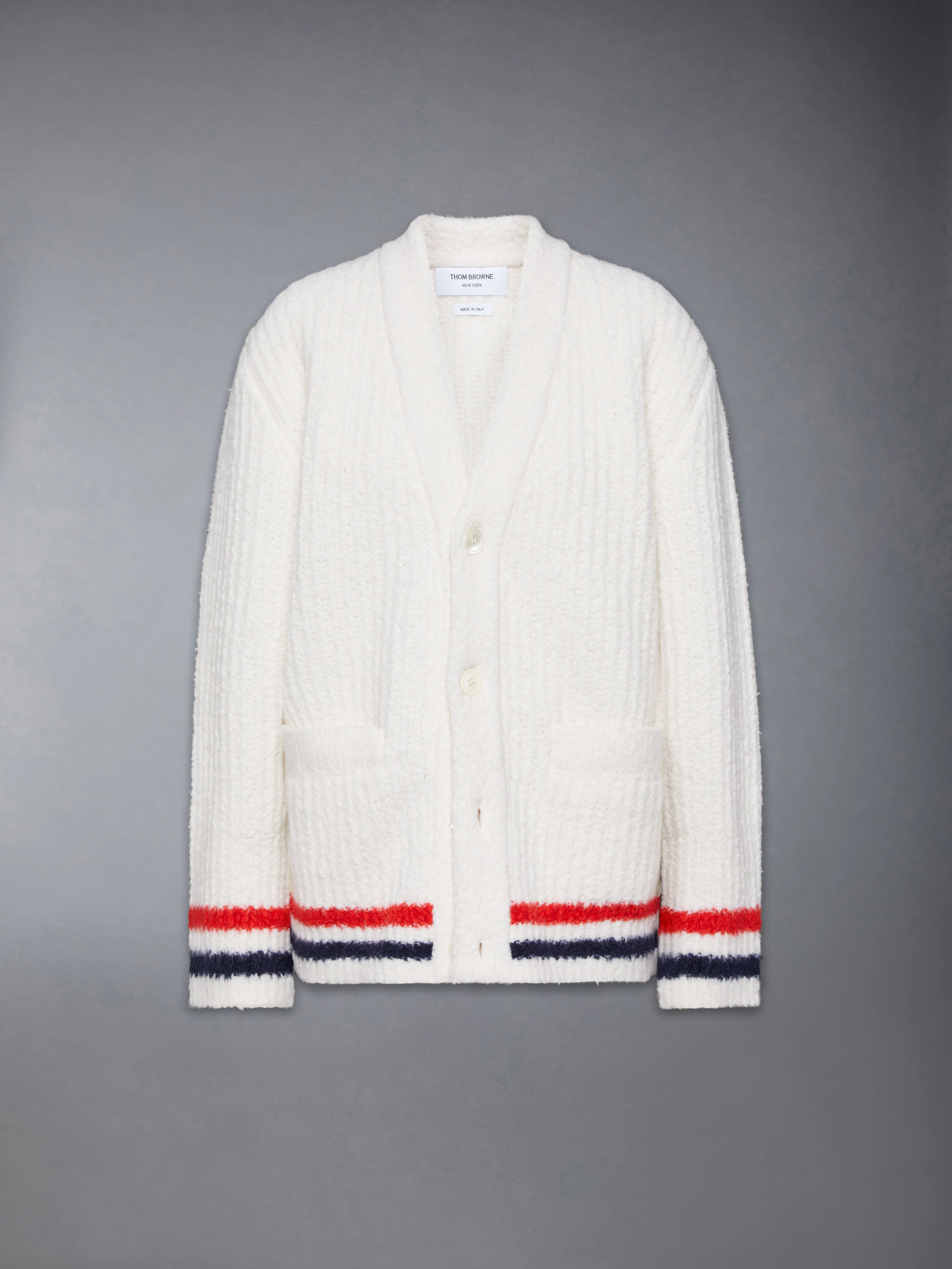 Envelop yourself in the warmth of merino wool. This chunky cardigan features signature Thom Browne trim and pockets for storing essentials. Layer it over one of our crisp poplin button-downs. Front button closure 2 Front slip pockets Buttoned cuffs with signature striped grosgrain trim Buttoned side vents with signature striped grosgrain trim Signature striped grosgrain loop tab Model is 6'1" (185cm), wearing size 1 100% Silk Lining: 100% Silk Made in Italy MKC604A-Y1054-100