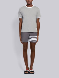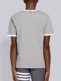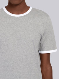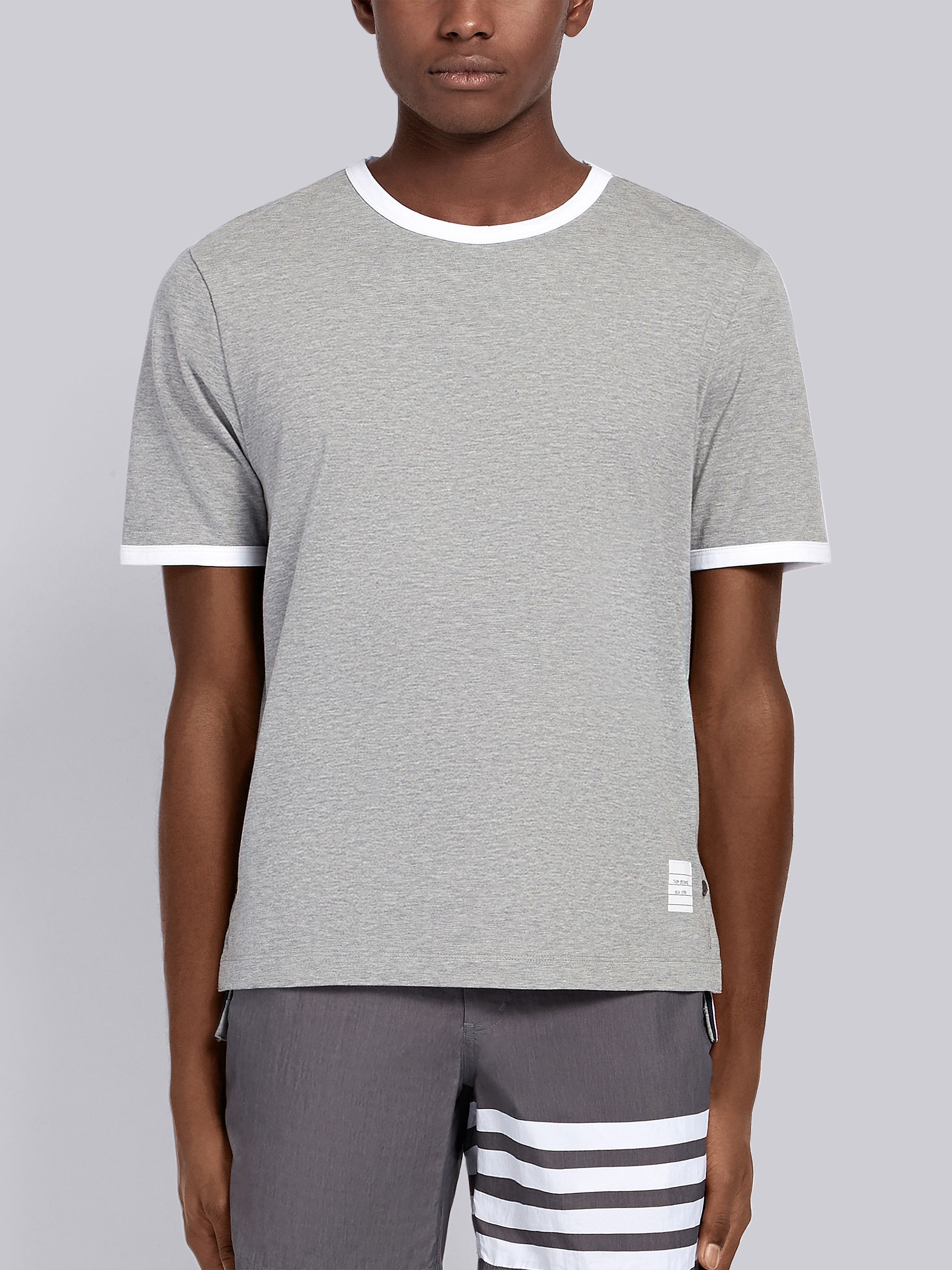 DETAILS & FIT Light Grey Ringer Tee Medium-Weight Jersey Short-Sleeve Button Vents RWB Trim Dropped Back Thom Browne 4-Bar Tag Signature Grosgrain Loop Tab Model is 61" (186 cm), wearing size 1. NOTES 100% Cotton Made in Japan MJS083A00042055 - CHEST: 97.0cm - Shoulder Width: 47.0cm