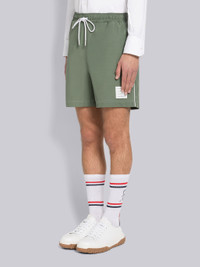 DETAILS & FIT Track shorts in dark green ripstop with white contrast stitching. Gathered waistband with white drawstring closure. Name tag applique above left cuff. Slip side pockets, single back welt pocket. Signature striped grosgrain loop tab at back waist. Model is 6' 1" (185cm), wearing size 1. 62% Cotton, 38% Nylon Made in Italy MJQ151A07651320