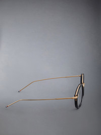 Always true to our American DNA and inspired by mid-century aesthetic, the Thom Browne eyewear collection is ideal for those who appreciate a sleek and sophisticated look. It's designed for individuals who exude confidence and wish to tell a story through their fashion statement. Black acetate Clear lens Round shape Signature 4-bar Striped enamel temple tips Eco-leather case Lens Width: 46/49mm Nose Bridge Length: 21mm Temple Length: 150mm 50% Acetate, 50% Titanium Made in Japan UEO011A-G0003-001