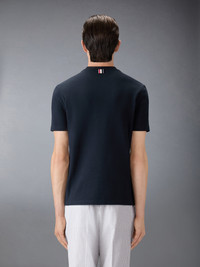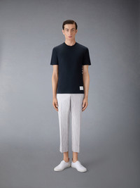 DETAILS & FIT A silhouette that has stood the test of time, our Classic Pique 4-Bar Tee is adorned with signature Thom Browne emblems throughout, and tailored to perfection. Crew neckline 4-bar stripe detail at left side Name tag applique above hem Signature striped grosgrain loop tab at back of neck Model is 6' 1" (185cm), wearing size 0 100% Cotton Made in Italy MJS123A-00050-415