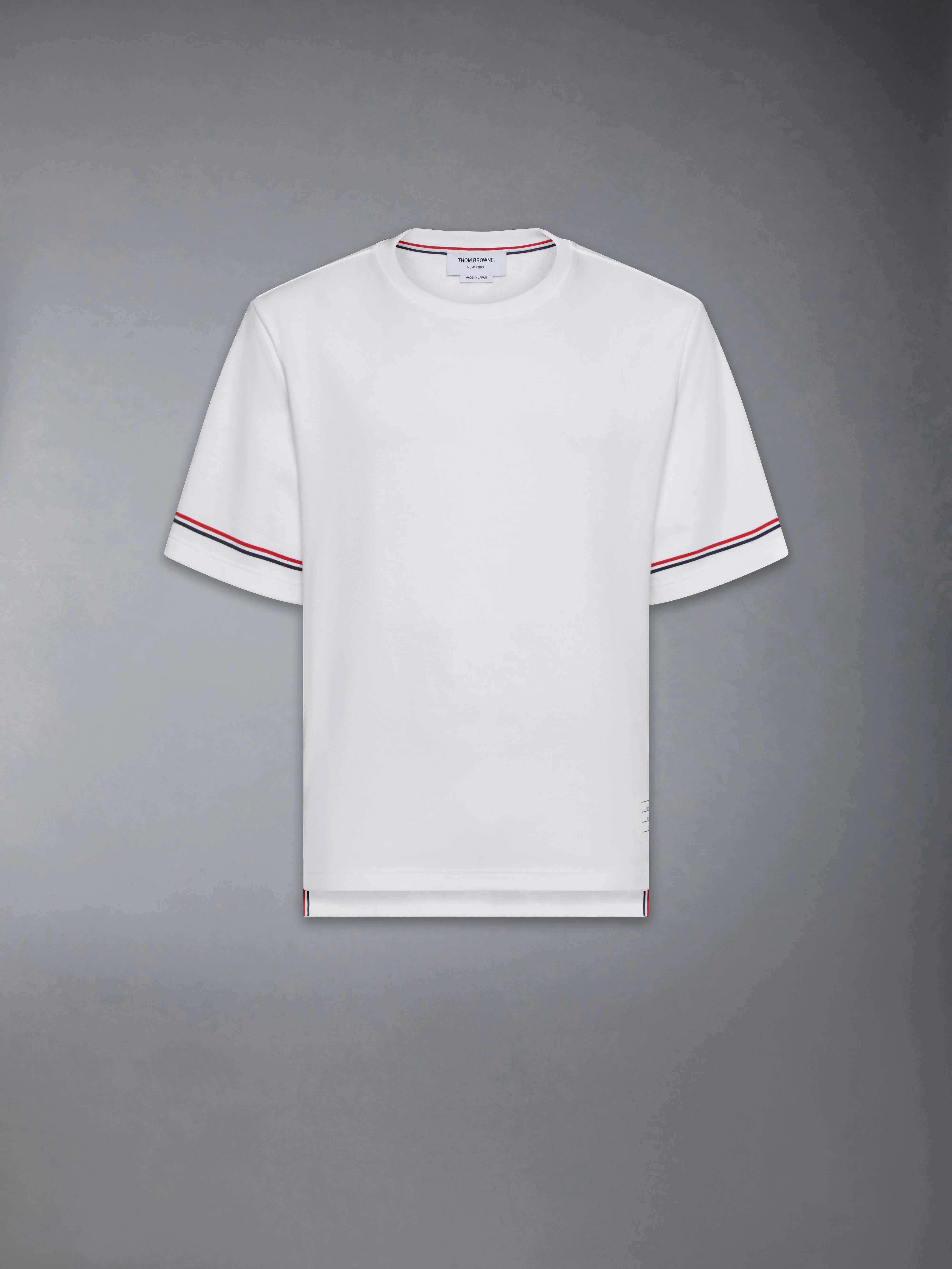 DETAILS & FIT A signature Thom Browne emblem defines this luxe long sleeve — our iconic tricolor trim. This casual shirt will serve as a staple in your seasonal wardrobe for years to come. Name tag applique Signature striped grosgrain loop tab Model is 6'1" (185cm), wearing size 1 100% Cotton Made in Italy MJS282A-J0199-100