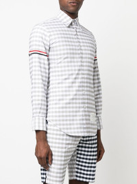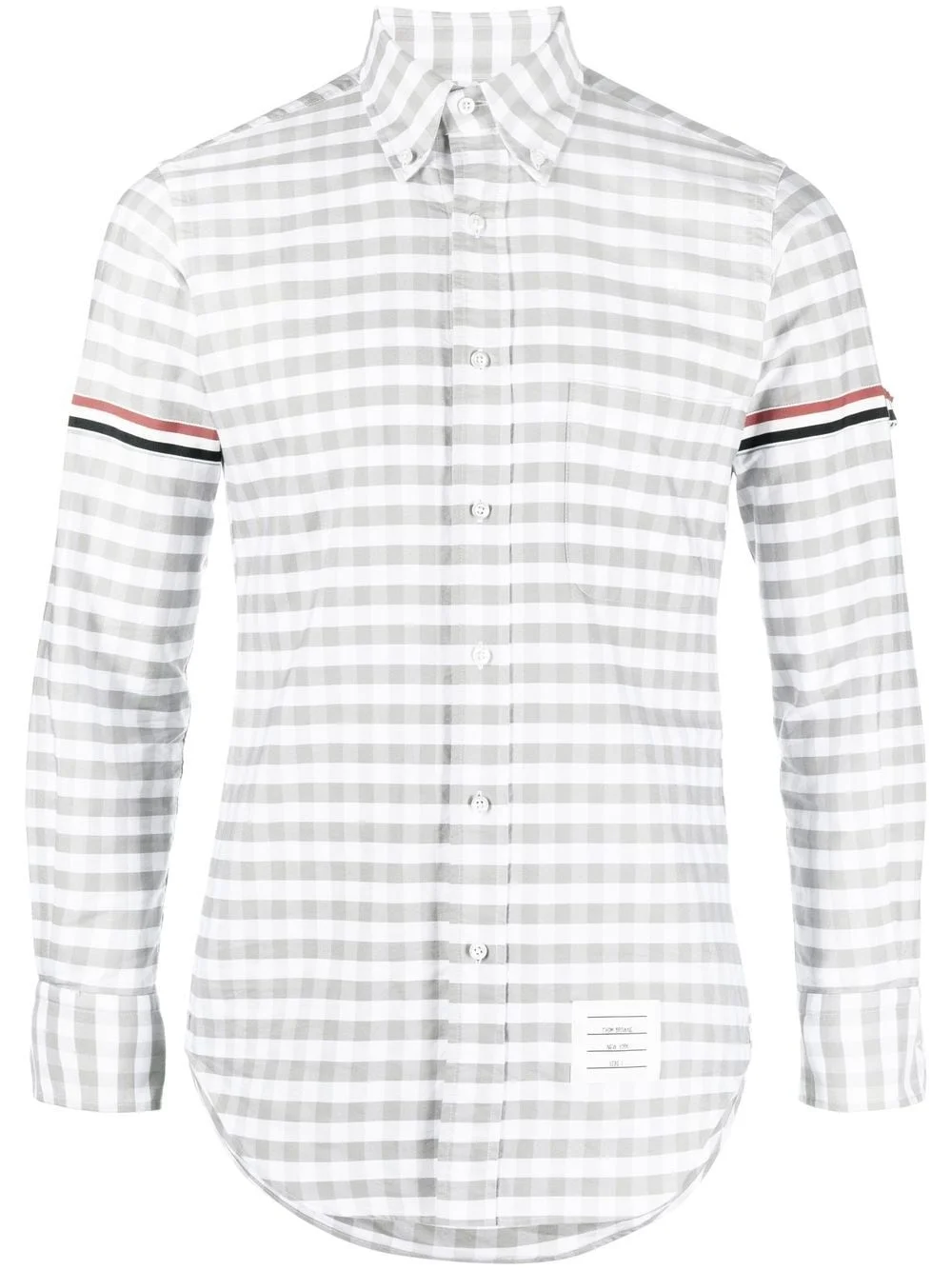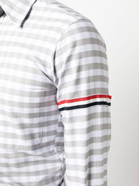 RWB gingham Oxford shirt The timeless Oxford shirt is given a contemporary look for SS23, as shown by this light grey and white iteration. Made in Italy from crisp cotton, this piece boasts a gingham check print throughout and is elevated with RWB stripes at the sleeves and Thom Browne's iconic 4-Bar patch at the front. Made in Italy Composition Cotton 100% SIZE & FIT Model measurements Height 6 ft 2 in(1.88 m) Bust/Chest 36.61 in(93 cm) Hips 35.82 in(91 cm) Waist 27.95 in(71 cm) FittingInformation Designed for a slim fit, offering a comfortable fit that sits just away from the body Made from a midweight non-stretch fabric This piece fits true to size – take your usual size