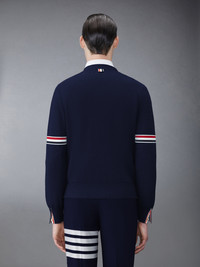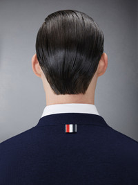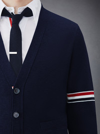 DETAILS & FIT A signature Thom Browne emblem defines our Cotton Milano V-neck Cardigan — grosgrain trim. Presented in quality cotton, this cardigan will stand the test of time. V-neckline Slip front pockets Signature striped grosgrain armbands Buttoned side vents and cuffs with signature Striped grosgrain trim Signature striped grosgrain loop tab at back of neck Model is 6' 1" (185cm), wearing size 1 100%Cotton Made in Italy MKC310A-Y3007-415