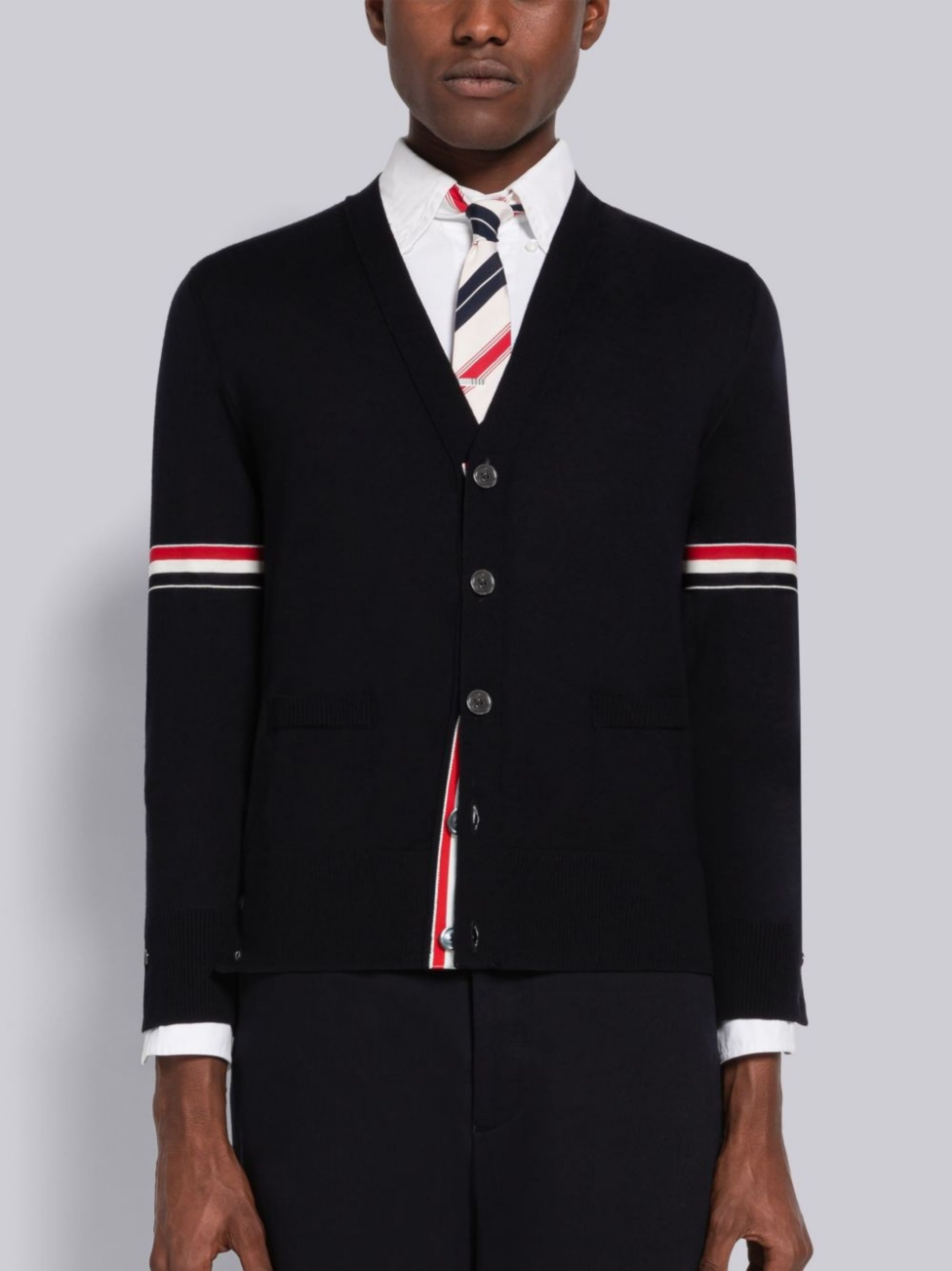 DETAILS & FIT Relaxed V-neck cardigan in navy jersey stitch Merino wool with stripe details at both sleeves. Front button closure with striped grosgrain placket. Buttoned side vents and cuffs with signature striped grosgrain trim. Ribbed cuffs and hem. Signature striped grosgrain loop tab at back of neck. Model is 6' 1" (185cm), wearing size .0 100% Virgin Wool Made in Italy MKC410AY1014415 - CHEST: 101.6cm - SLEEVE LENGTH: 62.2cm - Shoulder Width: 43.2cm - Length: 63.5cm - WAIST: 96.5cm