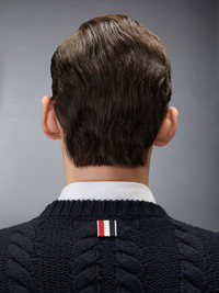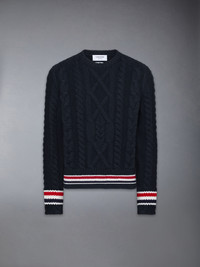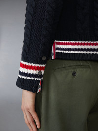Thom Browne reinterprets the classic Aran cable knit sweater with signature touches, blending heritage craftsmanship with modern style. Expertly crafted from fine merino wool, this timeless pullover provides exceptional warmth on crisp fall days and cool winter nights. Versatile and luxurious, it layers effortlessly over our Oxford shirts or beneath our outerwear. Buttoned side vents with signature striped grosgrain trim Buttoned cuffs with signature striped grosgrain trim Signature striped grosgrain loop tab Model is 6'1" (185cm), wearing size 1 98% Virgin Wool, 1% Elastane, 1% Polyamide Made in Italy MKA570A-Y1005-415