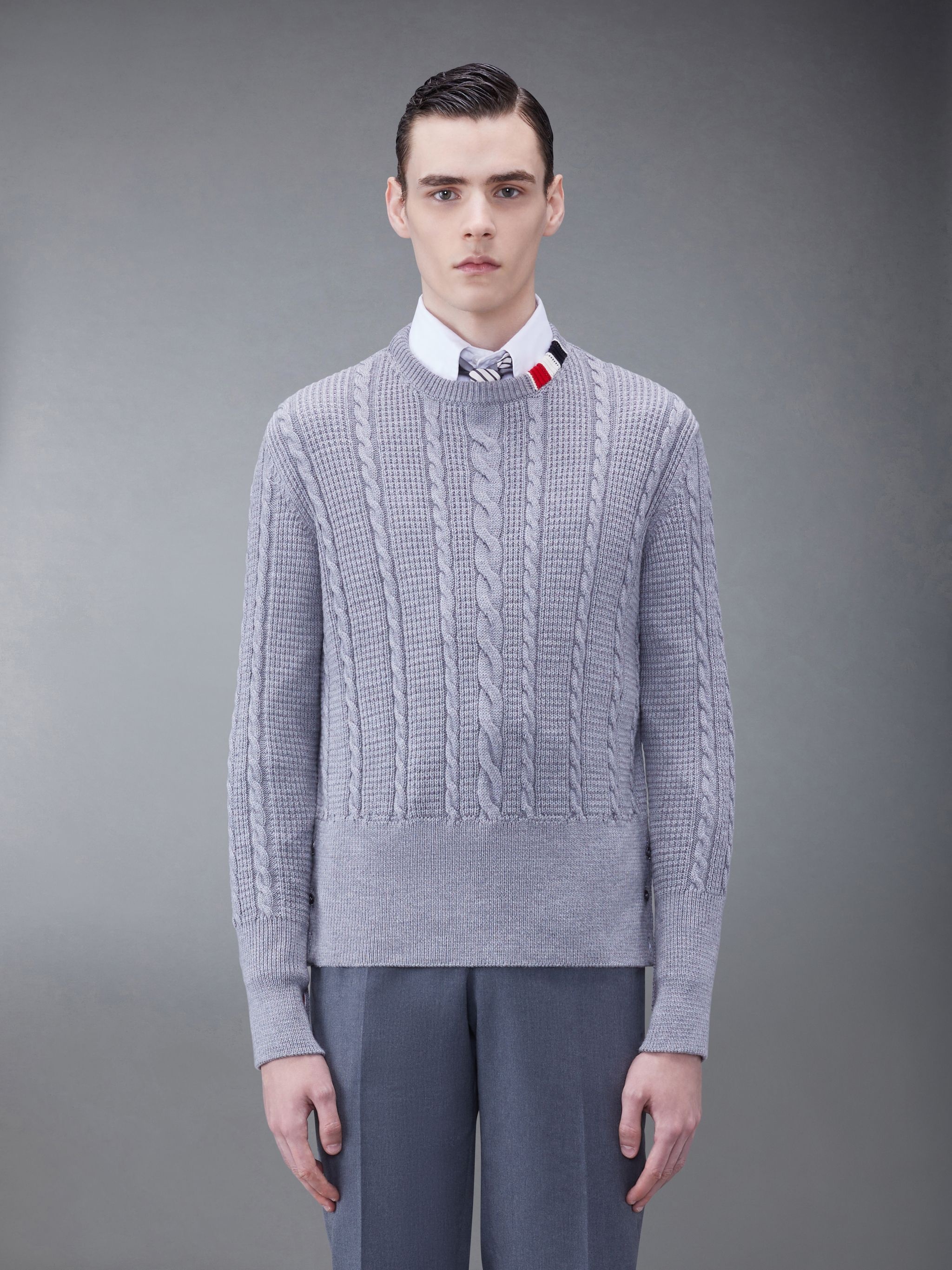 DETAILS & FIT This luxurious pullover exudes Thom Browne's mastery of innovative design and tailored excellence. Crafted from fine virgil wool. Buttoned cuffs with signature striped grosgrain trim Buttoned side vents with signature striped grosgrain trim Signature striped grosgrain loop tab Model is 6' 1" (185cm), wearing size 1 100% Virgin Wool MKA492A-Y1024-055